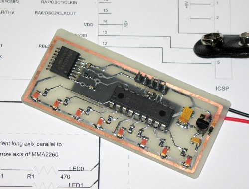 This little board demonstrates the capabilities of the MMA2260 +/- 1.5g X-Axis Micromachined Accelerometer. As you tip it back and forth, LEDs light up to show the magnitude and direction of the G force.